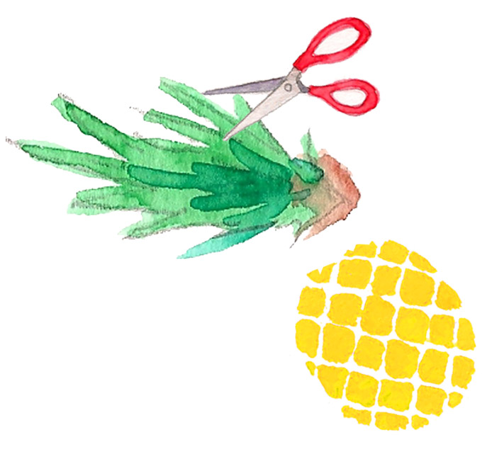 Séparez les feuilles du sommet de l’ananas, soit à la main par torsion, soit en tranchant le sommet du fruit. Attention la base des feuilles doit être intacte !