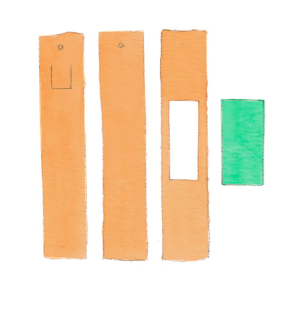 Taillez dans le carton restant trois bandes de 75 par 15 cm. Au sommet, percez un trou, centré, sur deux d’entre elles afin de pouvoir y faire passer la ficelle. Sur l’une des deux bandes percées, découpez une ouverture en forme de U pour pouvoir remplir la pinata. Sur la troisième bande, créez une ouverture centrale et recouvrez d’un morceau de papier crépon.